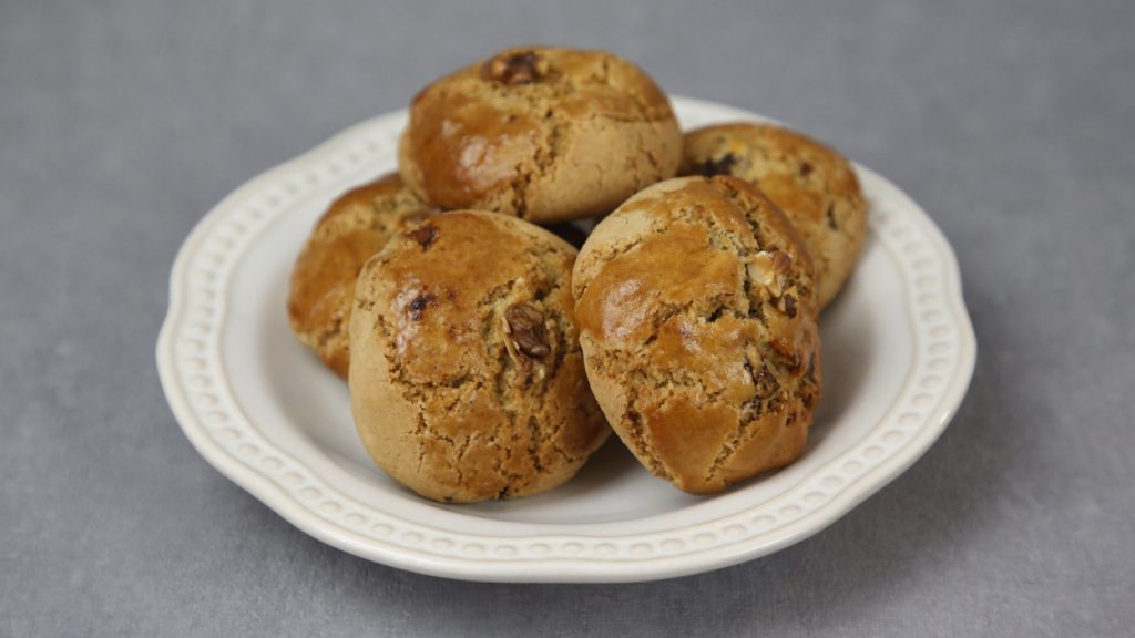 Imediatamente antes de entrar no forno, pincelar com ovo batido ou leite, colocar um quarto de noz e prensar com suavidade.